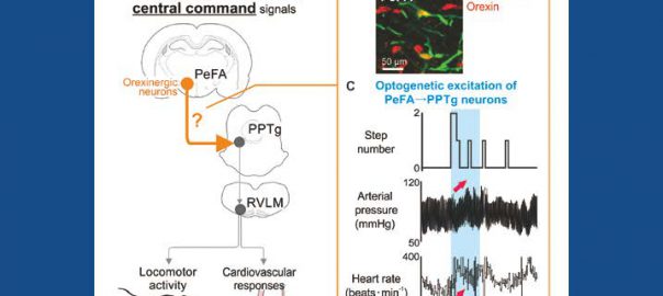 運動時には,運動実行の意思によって上位中枢で発生する神経活性(セントラルコマンド)が,体性運動系を制御して四肢および体幹の運動を制御するだけでなく,自律神経系をも制御し,体内恒常性維持に寄与する.セントラルコマンド機能を担う脳内回路メカニズムの全容は不明であるが,脚橋被蓋核(PPTg)を含む中脳歩行誘発野から延髄吻側腹外側野(RVLM)に至る経路が,セントラルコマンドを伝達する脳内回路の一端として同定されている(Koba,·Narai,·et·al,·Nat·Commun,·2022).本研究では,視床下部脳弓周囲野(PeFA)に局在するオレキシン産生神経はPPTgを介してセントラルコマンド機能の生成に関与するとの仮説を検証した.