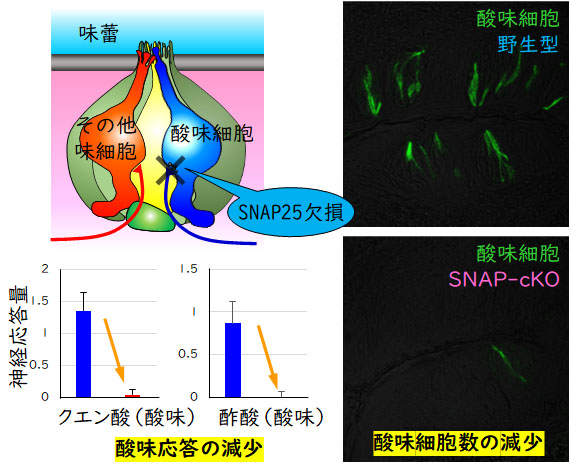 味蕾内でSNAP25を欠損するマウスでは、クエン酸や酢酸など様々な酸に対する味覚神経応答が減弱する。また、舌では酸味受容細胞の数が減少する。