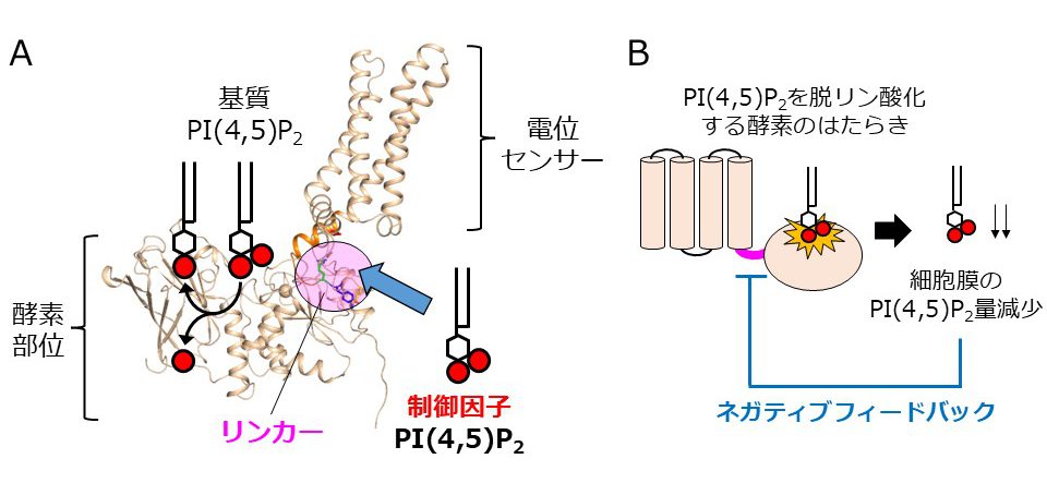 (A)VSPは電気信号を感知する電位センサーとイノシトールリン脂質PI(4,5)P2を脱リン酸化する酵素部位からなる分子です。両部位をつなぐリンカーと基質とは別のPI(4,5)P2との相互作用によって酵素のはたらきが制御されることが分かりました。