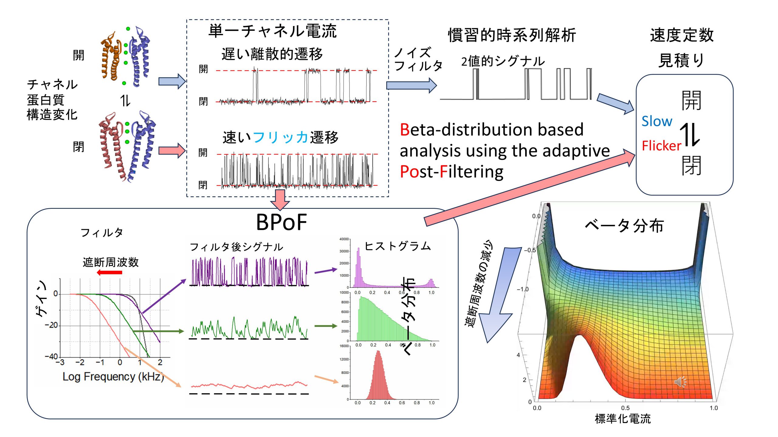 イオンチャネルをはじめとする蛋白質の機能は、ナノ秒から秒単位にわたる広範な時間スケールでの構造変化によって制御されています。単一チャネル電流記録法は、チャネルの開・閉状態間の遷移(ゲーティング)を直接捉える強力な手法ですが、その時間分解能には限界があります。この限界を超える極めて速い開閉は、個別の開閉事象として分解できず、「フリッカ」と呼ばれるノイズ様の電流として観測されます(図、フリッカ遷移)。フリッカ電流は、従来の時系列解析では状態間遷移速度を抽出することができず、多くのチャネルで観察されるフリッカは見過ごされてきました。この課題を克服するため、我々は全く新しい視点の解析法を開発しました(BPoF法[ベータ分布に基づく適応ポストフィルタリング法])2)。単一チャネル電流記録にはノイズを除去するために高周波遮断フィルタが使われます。フリッカは速いゲーティングなので、従来、遮断周波数(fc)を高く設定して記録してきました。この常識的な手法を転換し、極端に低いfcで処理したことがBPoF法の核心です。これにより電流トレースは大幅になまり、一見すると情報は失われたかのように見えます(図、カラートレース)。しかし、この操作こそが、時間領域に埋もれていた動態情報を、フィルタ後の電流振幅ヒストグラムの「形状」へと変換する鍵となります。驚くべきことに、フィルタの遮断周波数を下げていくと、ヒストグラムの形状は二峰性から非対称な一峰性分布へと連続的に変化し、この一連の形状変化は数学的な「ベータ分布」によって完璧に記述できます(図、3Dプロット)。そこで複数の遮断周波数で得られたヒストグラムを同時にベータ分布でフィットする方法を確立しました。これにより一見カオス的なフリッカ信号の中に、実は異なる速度論的性質を持つ2つのフリッカモード間を遷移する、より高次のゲーティング様式(モードスイッチ)が隠されていることを世界で初めて突き止めました1)。本手法は、従来の時間領域解析では捉えきれなかったチャネル動態の解明を可能にし、チャネルの複雑なゲーティング制御機構の理解に新たな道を開くものです。